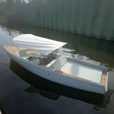Unsere Elégance Elektroboote werden im Vakuumverfahren aus einer Glasfaser- und PE-Wabensandwichmatrix hergestellt. Dies ergibt einen sehr steifen und trotzdem leichten Bootskörper der dabei trotzdem die Festigkeitseigenschaften eines gewöhnlichen Glasfaserlaminates besitzt.