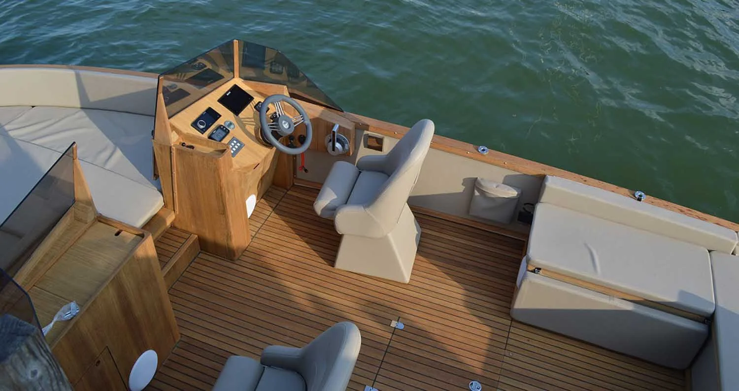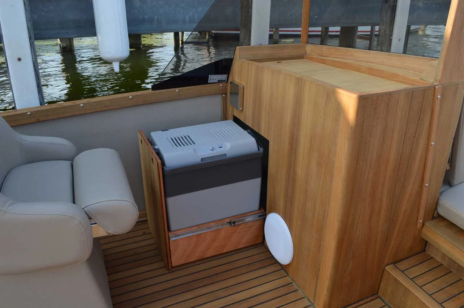 Viel Platz zum Sonnen und Entspannen bietet die großzügige Liegefläche. Unser edel gestaltetes Armaturenbrett mit Bordcomputer gibt Ihnen jederzeit Überblick über alle wichtigen Informationen, z. B. wie den Energiestand der Akkus. Das neue MY-Elégance lässt sich spielerisch und intuitiv bedienen. Das Bedienfeld am Steuerstand erlaubt es Ihnen, besondere Funktionen wie Restfahrzeit, Leistungsentnahme, Geschwindigkeit, Tiefen- und Temperaturmessungen zu nutzen.