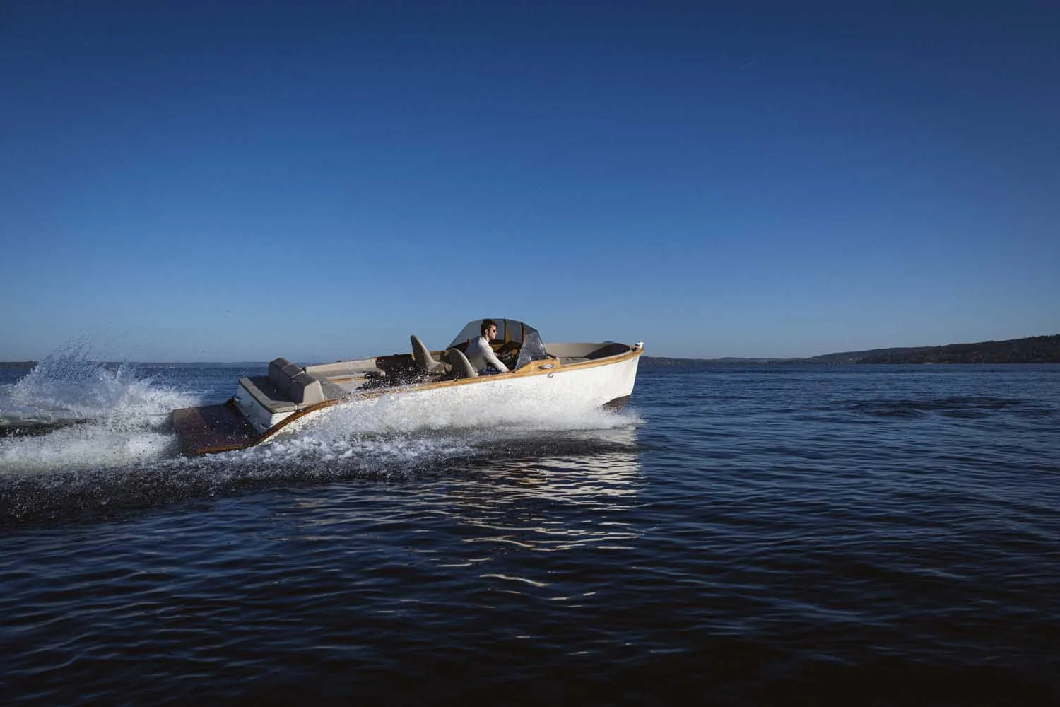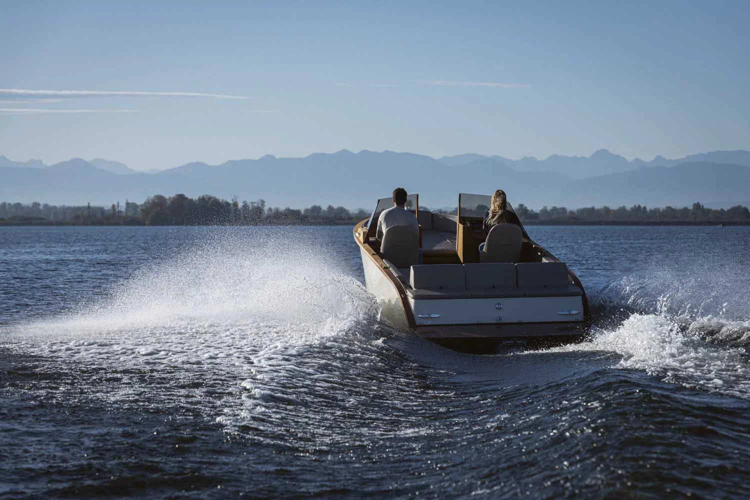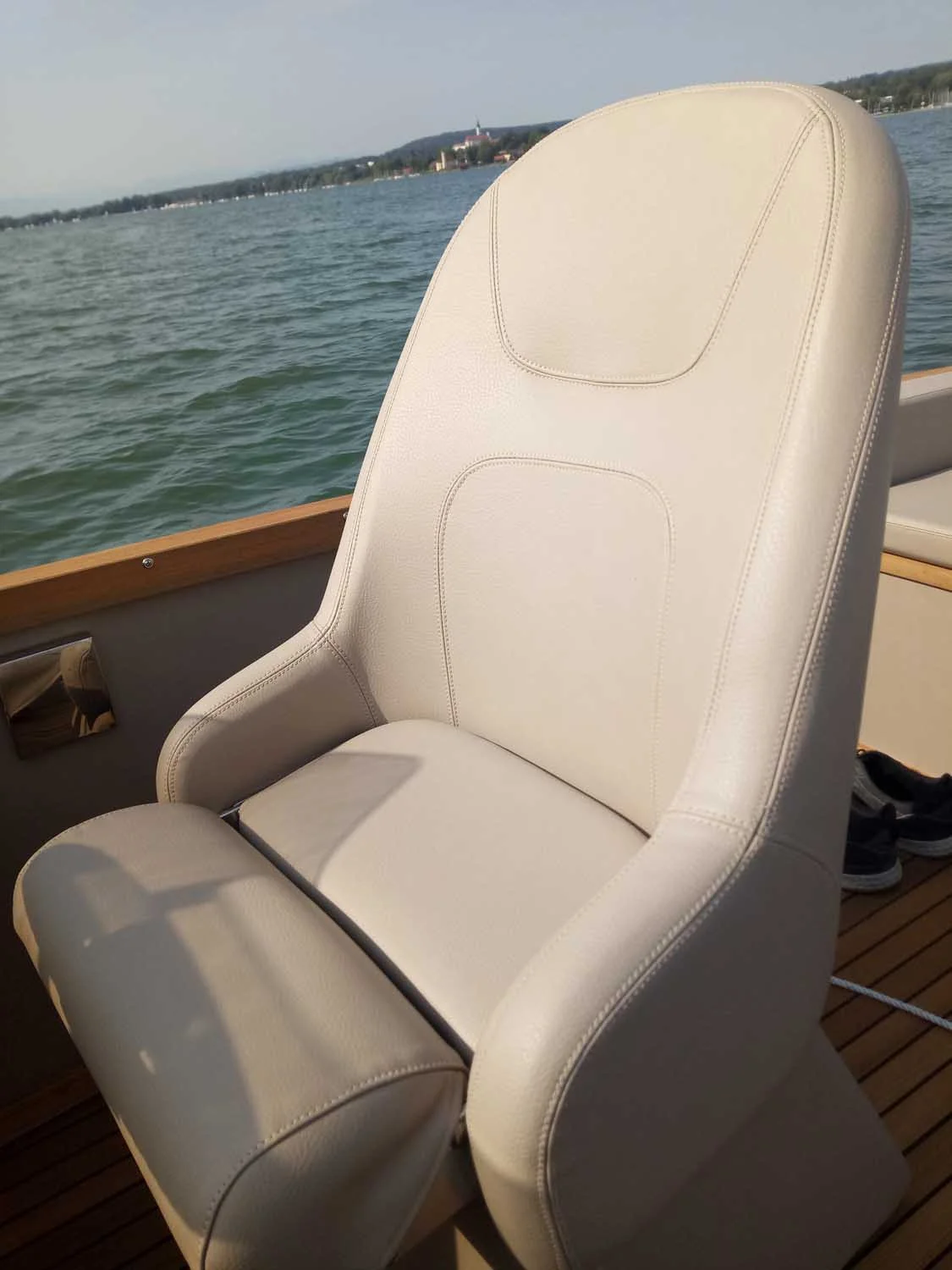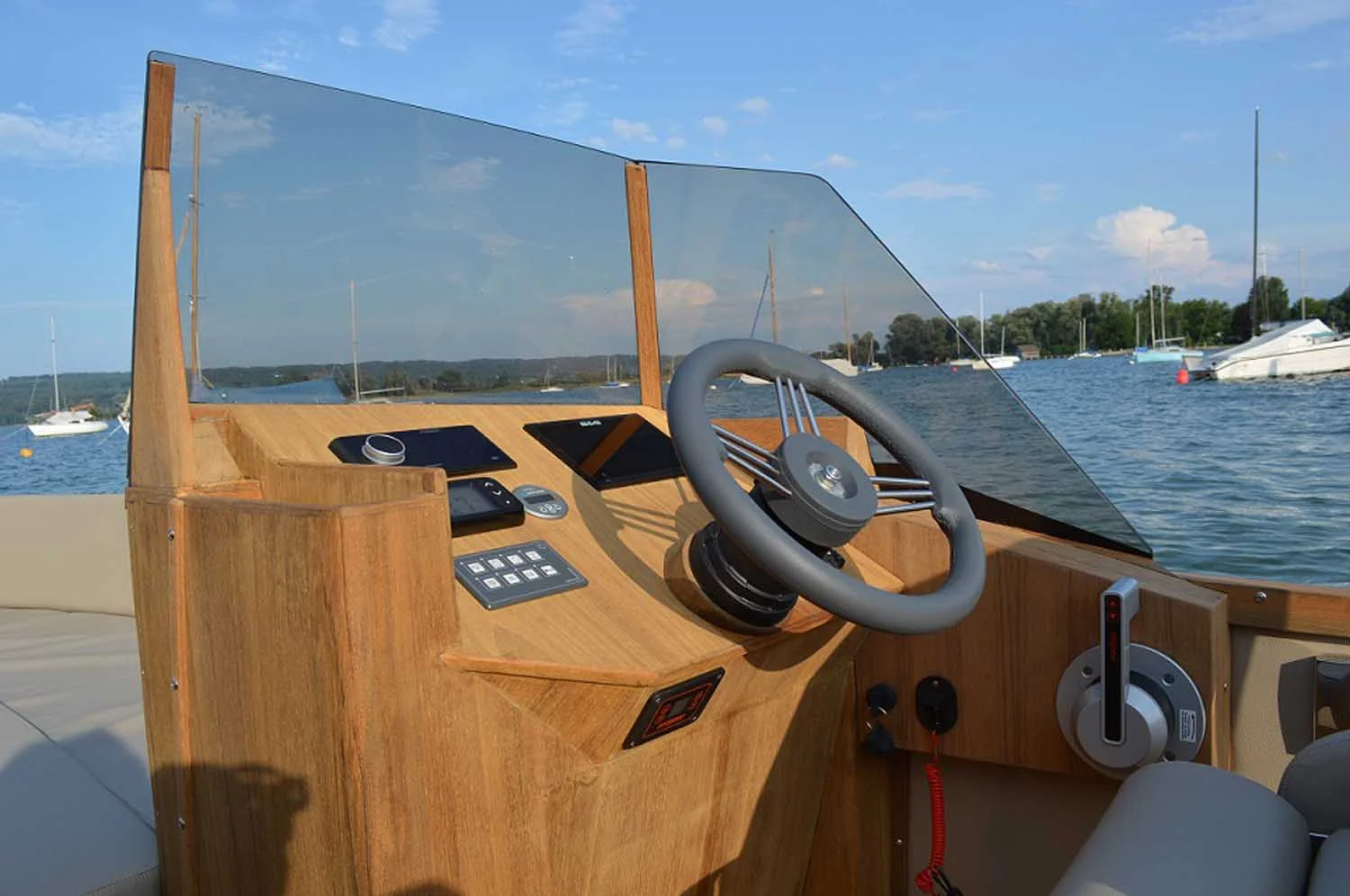200 Nm Drehmoment – immer. Wer einmal ein Elektroboot gefahren hat, kommt aus dem Staunen gar nicht mehr heraus: Das Fahrerlebnis ist tatsächlich atemberaubend. Während ein herkömmlicher Verbrennungsmotor erst deutlich oberhalb der Leerlaufdrehzahl maximal beschleunigen kann, steht das maximale Drehmoment eines Elektroantriebs bereits im Stillstand zur Verfügung. Das MY-Elégance Elektroboot beschleunigt so atemberaubend von 0 auf 40 km / h. Entscheiden Sie zwischen komfortablem, dynamischem oder sparsamem Fahren – ganz einfach per Knopfdruck. Der hochwertige Antrieb von Torqeedo sorgt für lange und zuverlässige Fahrt auf dem Wasser.