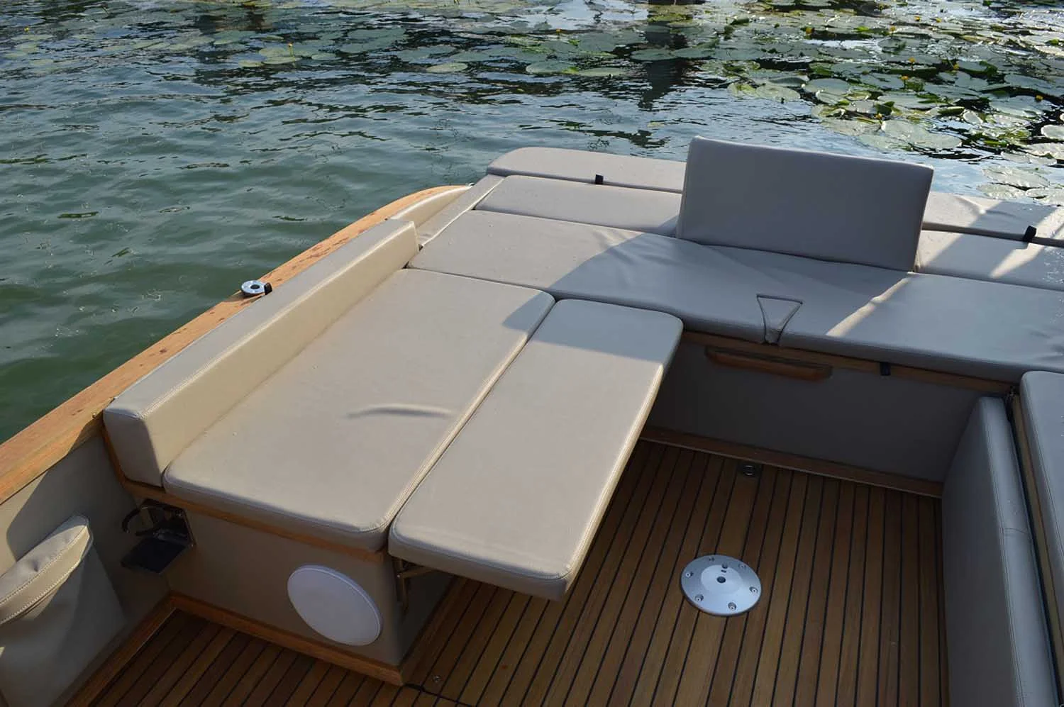 Teilen Sie das Erlebnis Elektrobootfahren auf dem MY-Elégance mit bis zu acht weiteren Insassen. Das Elektroboot kann ganz individuell mit einem Sitzbereich mit Tisch ausgestattet und/oder mit einer großen Liegefläche ausgestattet werden. Es verfügt dabei immer über reichlich Bewegungsfreiheit. Im hinteren Bereich des Elektrobootes freuen sich nicht nur Kinder über jede Menge Platz auf der Badeplattform, auch die erwachsenen Mitfahrer des MY-Elégance genießen die große Liegefläche mit edlen Materialien, hochwertiger Verarbeitung und auf Wunsch exklusiven Komfortausstattungen.